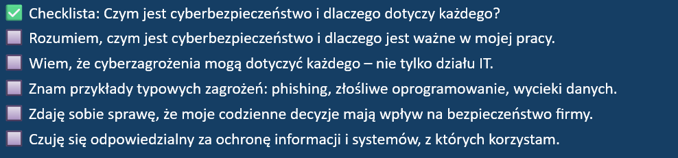 Podsumowując: cyberbezpieczeństwo dotyczy każdego, kto korzysta z technologii. Im większa nasza wiedza i ostrożność, tym mniejsze ryzyko, że staniemy się słabym ogniwem w łańcuchu zabezpieczeń. To nie kwestia wyboru, ale obowiązek – nie tylko wobec pracodawcy, ale też klientów, współpracowników i samego siebie.