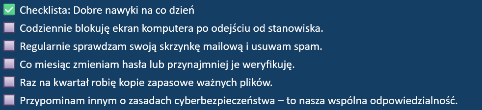 Budowanie dobrych nawyków to proces. Nie trzeba wdrażać wszystkiego naraz, ale warto konsekwentnie pracować nad każdym punktem. W cyberbezpieczeństwie nie chodzi o bycie idealnym, ale o bycie czujnym, świadomym i gotowym reagować. Nawet najmniejsze działania – powtarzane regularnie – mają ogromne znaczenie dla bezpieczeństwa całej organizacji.